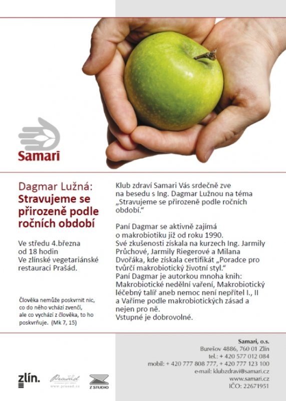 Klub zdraví Samari tentokrát přivítá Ing. Dagmar Lužnou, která bude s námi besedovat na téma Stravujeme se přirozeně podle ročních období.