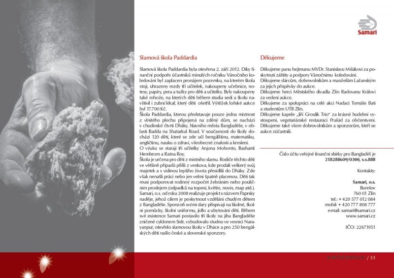 Výtěžek akce bude použit na provoz slamové školy Paddardia v Bangladéši. Tato škole je určena pro nejchudší z nejchudších v hlavním městě Bangladéše v Dháce. Do školy, která představuje jednu místnost z vlnitého plechu, chodí v současnosti 121 dětí. Vzhledem k nedostatku místa, děti navštěvují školu ve třech etapách – ráno, odpoledne, večer. Učí se zde bengálštinu, matematiku, angličtinu, nauku o zdraví, všeobecné znalosti a kreslení. O výuku se starají tři učitelky Anjona Mohonto, Bashanti Hembrom a Ratna Roy.