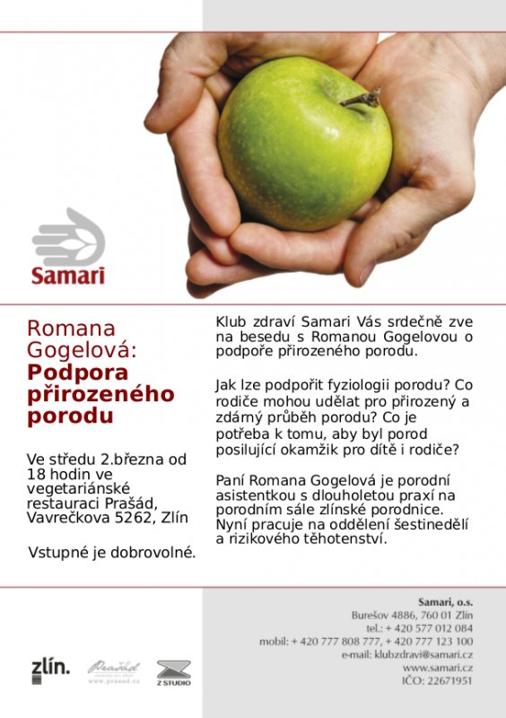 Klub zdraví Samari Vás zve na besedu s Romanou Gogelovou na téma Podpora přirozeného porodu.