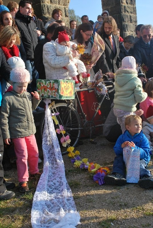 druhou odpolední se u Centra začínají houfovat účastníci Pavlovy svatby. Tentokrát na ně nečekají nazdobená auta, ale opentlené bicykly. Ženich v obleku a se zapřaženým vozíkem se dvěma batolaty vyráží do ulic jako první. Za ním peloton asi dvaceti cyklistů, nevěstu nevyjímaje. Prosluněným podzimním lesem účastníci dojedou až k nádherné vyhlídce, na níž stojí impozantní kostelík „U obrázku“. Právě v jeho útrobách si novomanželé říkají své „ano“. Nevěsta zpočátku trochu nezřetelně, takže ji oddávající pastor vyzve, ať to zopakuje. Áááánóóó!, zakřičí na celé kolo manželka Zdeňka ke spokojenosti pastora, chotě Pavla i nadšeného publika. Blahopřání davů, kolečko kolem kostela na dvojkole a jde se slavit. Kde jinde, než k nedaleko plápolající vatře. Přepestré svatební menu se podává na prostřeném papundeklu, bramborový guláš do misek v rohu u kostela a přípitek obstarává chladná voda čerstvě načepovaná ze studánky.