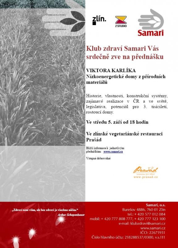 Klub zdraví Samari Vás srdečně zve na první poprázdninovou přednášku. Tentokrát nám bude přednášet Viktor Karlík ne téma Nízkoenergetické domy z přírodních materiálů. Přednáška se jako tradičně uskuteční ve středu 5. září od 18-té hodiny ve zlínské vegetariánské restauraci Prašád.
