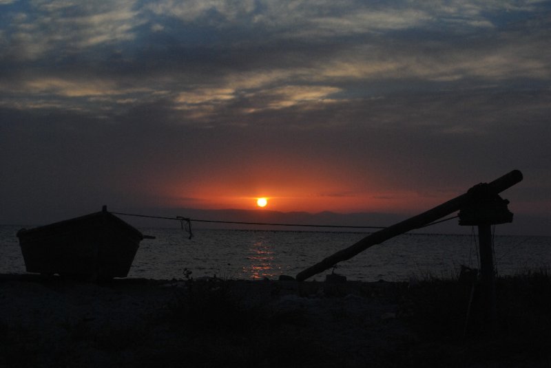 Zmíněná muzikoterapeutická produkce však není mým stěžejním nočním problémem. Ležím totiž na dně vyschlého jezera, které se naplní pokaždé, když foukající blizard rozčeří hladinu do podstatnějších výšek. Půldruhametrová vlna se lehce přehoupne přes mělký písečný předěl a během chviličky tu máme hektarovou jezerní plochu. Už během večera foukalo docela slušně, teď, před ránem, se však rákosí málem dotýká mého plápolajícího přístřešku. Vzdávám se původní představy růžového dospání a ještě za hluboké temnoty chvatně balím vichrem odvívané kusy mých nezbytných životních potřeb. S krosnou na zádech pak zamířím k pár desítek vzdálenému pobřeží. Navzdory neutuchajícím poryvům, je moře jen sympaticky načechrané. Coby rodilý suchozemec tomu pranic nerozumím.