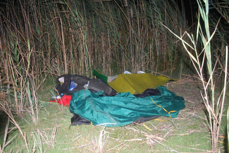 Finále mé stanovací série nevyhlíží nikterak pompézně. Sedmdesát centimetrů vysoký plátěný objekt se krčí mezi pětkrát vyššími stvoly rákosu. Suché zbytky uvedené byliny mi také slouží jako palivo na závěrečný minitáborák, nezbytný k přípravě poslední večeře. Tvoří ji odvar ze zbytku ovesných vloček, oschlého bílého chleba a poloviny cibule. Přisolené a okořeněné stroužkem česneku je to celkem jedlé, ale žádná velká sláva. Nic jiného jsem už z potravinové igelitky nevydoloval.