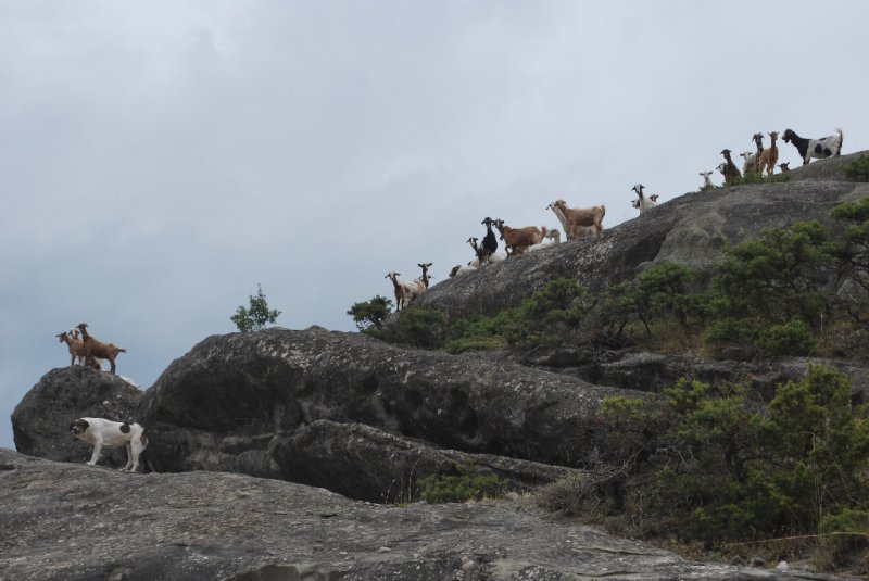 další. Hlídají tu padesátihlavé stádo rohatých koz zvědavě zírajících z kamenného horizontu. V krajině bez lidí, docela zajímavá situace. Obejít to tady nikterak nepůjde, nezbude, než se probít! Naštěstí je Řecko zemí kamení. Zvednu dva šutry, zamířím a neřízené střely okamžitě přistávají v těsné blízkosti rámusících šelem. Přidávají se další a další. Vůdčí dvojka se raději klidí z cesty na skálu. Pět metrů nade mnou se pak kompletní šestice občas formuje do klasického půlkruhového útočného postavení. Štěká, vrčí, zlověstně cení nabroušené tesáky. Ať se na mne mírumilovní pejskaři nezlobí, ale moje šutronáda pokračuje dalším kolem. Nějaký ten zásah tam patrně bude, přežívají však evidentně všichni. Je to zlé, ale silové řešení bývá někdy jediné možné. Cesta do Samariny má opět zelenou!