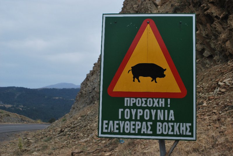 pár kilometrů dál si nemohu nevšimnout zatím nevídané dopravní značky. Uprostřed žlutého trojúhelníku, černý vepř domácí. U nás by asi nesla název „Pozor, prase!“ Zatím jenom tuším nač to upozorňuje v Řecku, zato přesně vím, co by to znamenalo v mé rodné vlasti: Varování před způsobem jízdy většiny majitelů vozů nejvyšší třídy. Pochoduji už dobré tři hodiny zvrásněnou hornatinou bez potoků a říček. Vymletá koryta jsou totálně vyschlá . Jediným zdrojem vláhy je čím dál silnější mrholení přecházející v mírný déšť. Blíží se páteční večer a s ním i následná sobota. Název víkendového dne pochází ze slova sabat, což znamená ustat, posedět, odpočinout. Ale kde tady, v bezvodé divočině? Přichází jeden z tisíců momentů, kdy se přízemní, horizontální uvažování protíná s vertikálou. Mé myšlenky míří, jako už tolikrát během uplynulých dvou dnů, kamsi nahoru. Do půl hodiny jsem v malebném údolí s proudící vodou…
