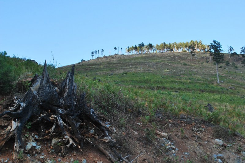 Je už pomalu tma, ale to, co zahlédnu uprostřed cesty, dokážu bleskurychle a spolehlivě identifikovat: Úhledná hromádka nefalšovaného medvědího trusu! Po nějaké čtvrthodině další. Postupně nejméně pět neklamných znamení přítomnosti brtníka, z toho ten poslední docela čerstvý. Dobré náladě nepřidává ani čím dál temnější, dramaticky tvarovaná krajina s dovysoka vyčnívajícími pahýly někdejších borovic.