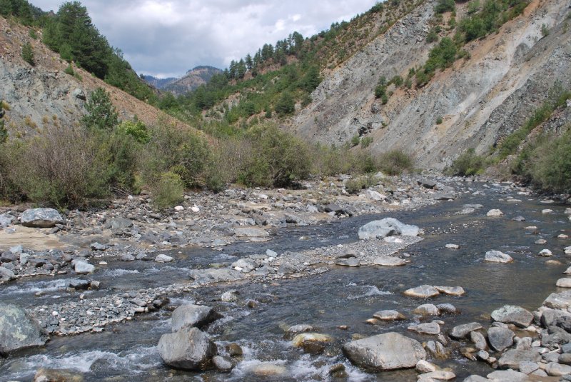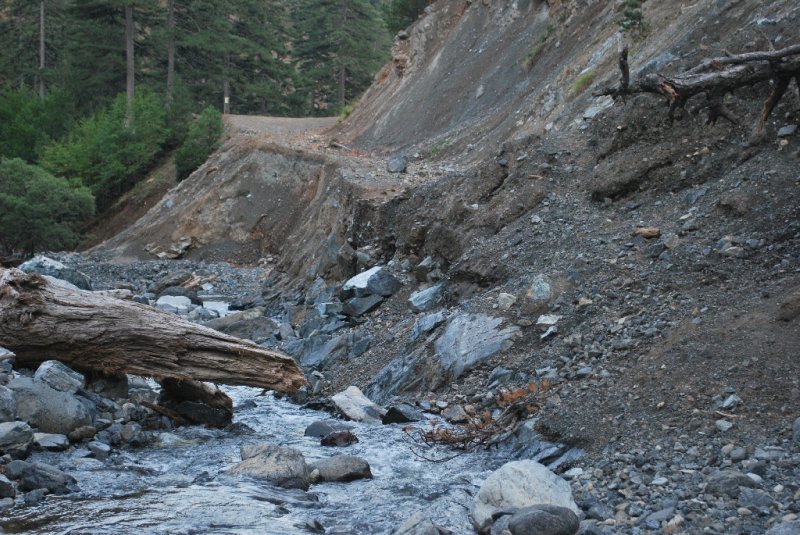 Svahy po obou stranách jsou tady skoro úplně holé. Jen sem tam trčí k hasnoucímu nebi suchý strom nebo jeho ohořelé torzo. Lesní požáry se nevyhýbají ani těmto divokým končinám. Co nezvládl oheň, dokonala dravá voda. V místě, kde v údajná okreska ještě nedávno přetínala vodní tok, je teď vymleté hluboké koryto. Proud odnesl s kusem cesty i dřevěný most. Do map by se měla co nejdříve dostat aktualizace: Silnice sjízdná pouze pěšky, nanejvýš na koni…