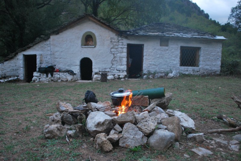 Nezbývá mi než věřit, že tady, na dolním konci, to bude o něco lepší. U bílého kostelíka praštím krosnou o zem a jdu prozkoumat okolí. Kromě koňského trusu a hromádek druhu homo sapiens tu žádné jiné ostatky nestrávené krmě nenalézám. Což je náramně milé zjištění, stejně jako to, že monastýr je otevřený. Jak se zdá, i pro návštěvníky typu jako jsem já. Hned vedle bohoslužebné místnosti se svícny, ikonami a obrázky svatých na stěnách se nachází komnata s obrovským balvanem a s krbem na topení. Vedle toho několik roštů, lžička a hrnec i s pokličkou. Paráda, zahraji si na víkendového poustevníka!